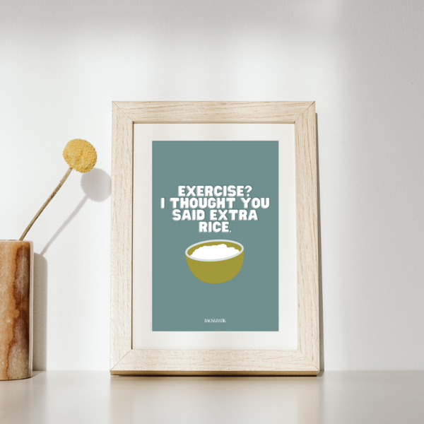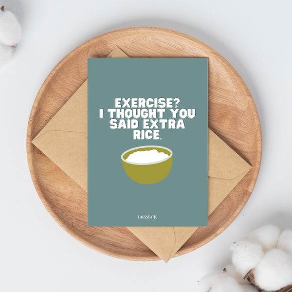 Zou je graag een speciaal kaartje willen sturen naar je beste vriend, familielid of kennis? "Exercise? I thought you said extra rice.''Niet alleen een leuke boodschap om als kaart te versturen, maar ook om in te lijsten en aan de muur te hangen!