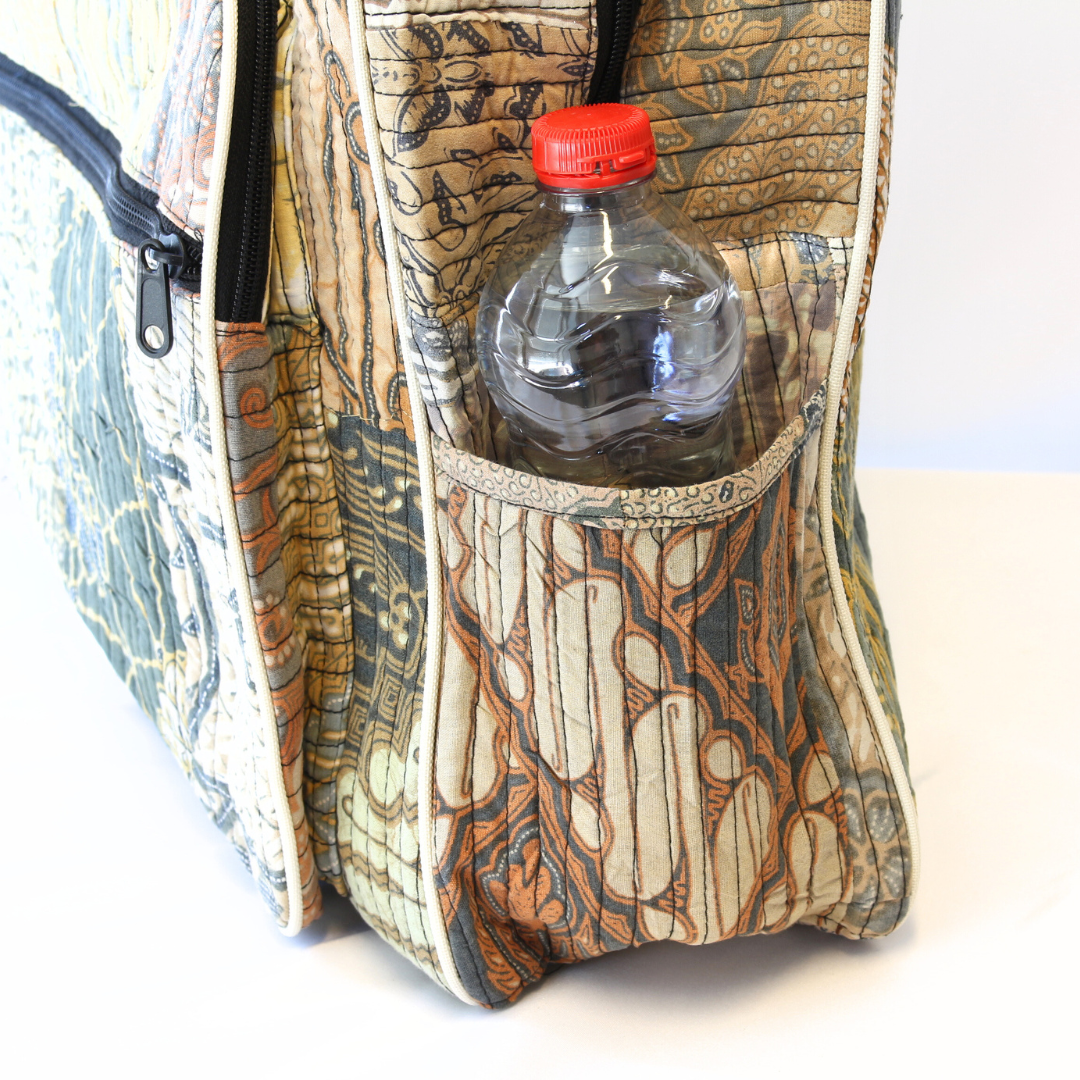 Ontdek de unieke samenstelling van deze tas, waarbij diverse stukken batik stof zorgvuldig zijn samengevoegd. Dit proces staat bekend als patchwork, waarbij verschillende lapjes stof met zorg worden gecombineerd (Patch betekent: lapje stof).