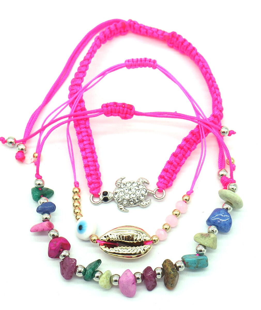 Dit leuke setje roze armbanden bestaat uit 3 verschillende bandjes. 1 schildpadje, 1 schelp en steentjes. Je kan ze eenvoudig los van elkaar dragen of als een set. Shop dit setje nu voor jezelf of als cadeautje voor een ander!