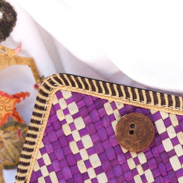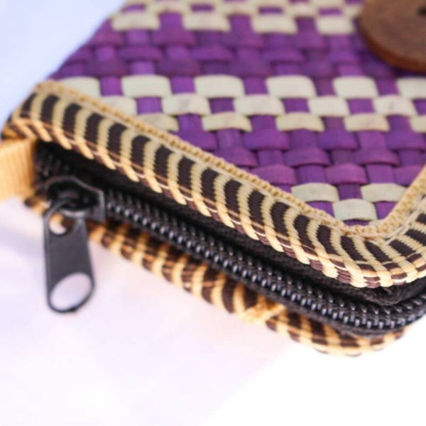 Een handgemaakte portemonnee uit Indonesie. Gemaakt van rotan met een knoop van een kokosnoot. Perfect voor muntgeld, briefgeld en je pinpas kan je eenvoudig in de zijvak plaatsen.